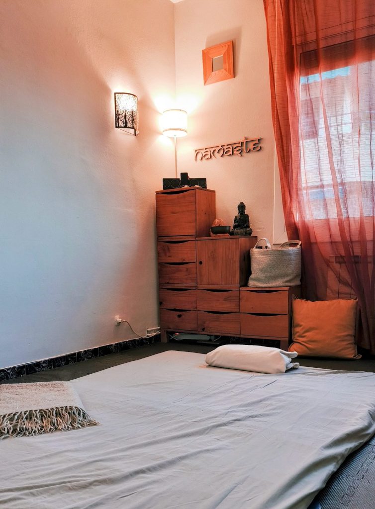 La saleta és un espai polivalent preparat per realitzar sessions de Shiatsu, treballs d’entrenament personal de Pilates, mobilitat o sessions de meditació en grups reduïts.